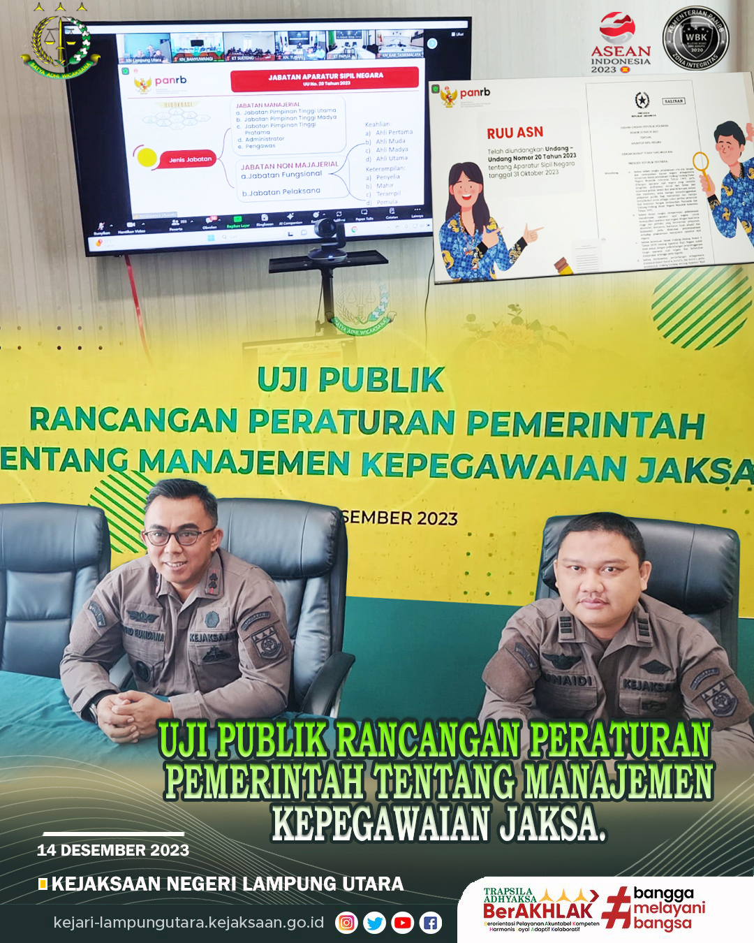 Kepala Kejaksaan Negeri Lampung Utara Mohamad Farid Rumdana, S.H., M.H. didampingi Staf Sub Seksi Pembinaan Kejaksaan Negeri Lampung Utara Junaidi, S.H. mengikuti Kegiatan Uji Publik Rancangan Peraturan Pemerintah tentang Manajemen Kepegawaian Jaksa