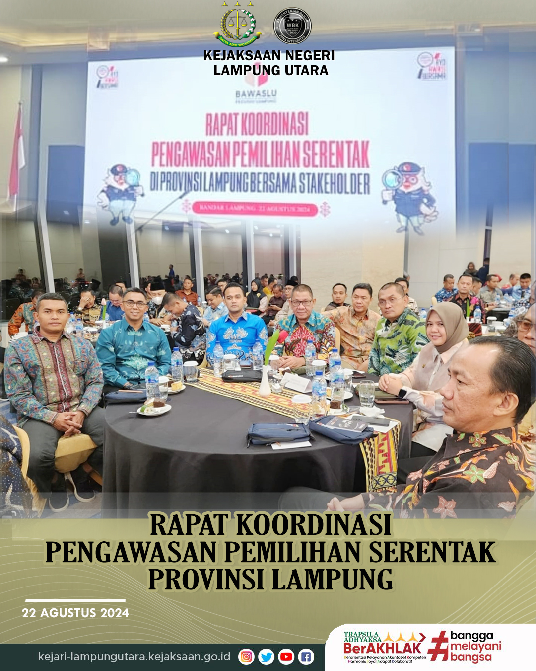 Bertempat di Ballroom Hotel Grand Mercure Bandar Lampung (Kamis, 22 Agustus 2024) Kepala Kejaksaan Negeri Lampung Utara, Mohamad Farid Rumdana, S.H., M.H. Menghadiri Kegiatan Rapat Koordinasi Pengawasan Pemilihan Serentak Di Provinsi Lampung bersama Stakeholder.