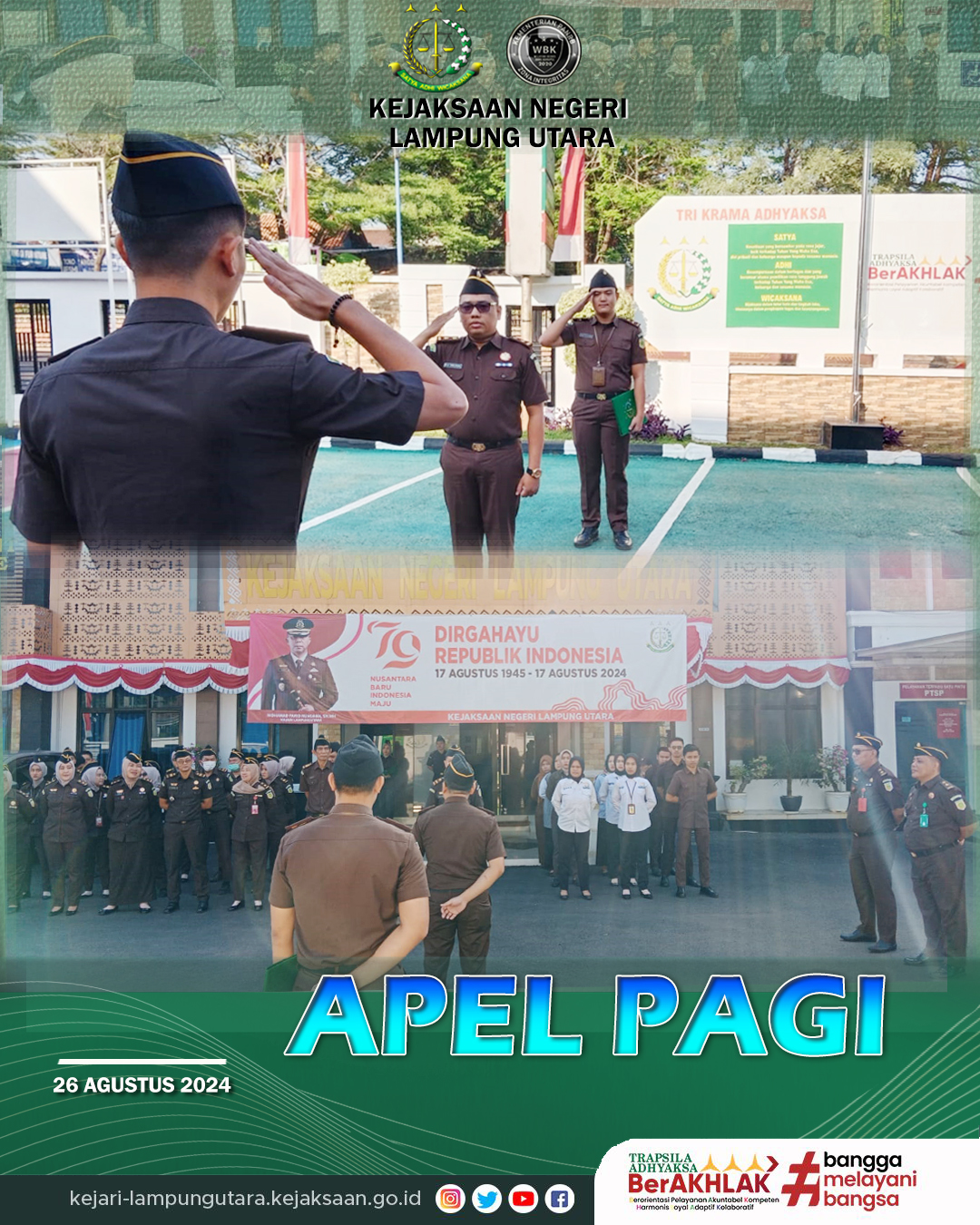 Senin, 26 Agustus 2024. Kepala Seksi Tindak Pidana Khusus Kejaksaan Negeri Lampung Utara (Muhammad Azhari Thanjung, S.H.) memimpin Apel Pagi yang di ikuti oleh Para Kasi, Jaksa, serta seluruh Pegawai dan Honorer pada Kejaksaan Negeri Lampung Utara.