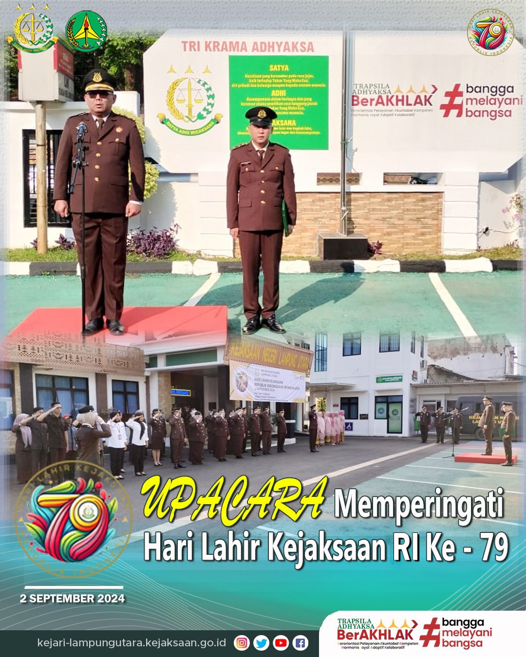 Plh. Kepala Kejaksaan Negeri Lampung Utara (Hery Susanto, S.H.) memimpin Upacara dalam rangka memperingati Hari Lahir Kejaksaan Republik Indonesia Ke-79 Tahun 2024 yang di ikuti oleh Kasubbagbin, Para Kasi, Jaksa, Ibu-Ibu IAD Daerah Lampung Utara serta seluruh Pegawai dan Honorer pada Kejaksaan Negeri Lampung Utara.