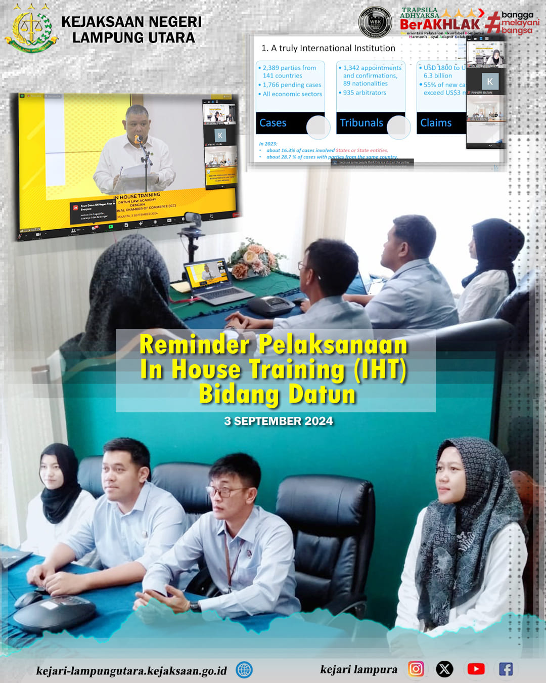 Kepala Seksi Perdata dan Tata Usaha Negara Kejaksaan Negeri Lampung Utara (Rahmat Hidayat, S.H.,M.H.) Beserta Jaksa Pengacara Negara (JPN) Kejaksaan Negeri Lampung Utara (Chandra Rizki, S.H., M.H.) dan Staf pada Bidang Perdata dan Tata Usaha Negara Kejaksaan Negeri Lampung Utara menghadiri Kegiatan Reminder Pelaksanaan In House Training (IHT) Bidang Datun, yang diikuti melalui media Video Conference (Vicon) Bertempat di Ruang Vicon Kejaksaan Negeri Lampung Utara.