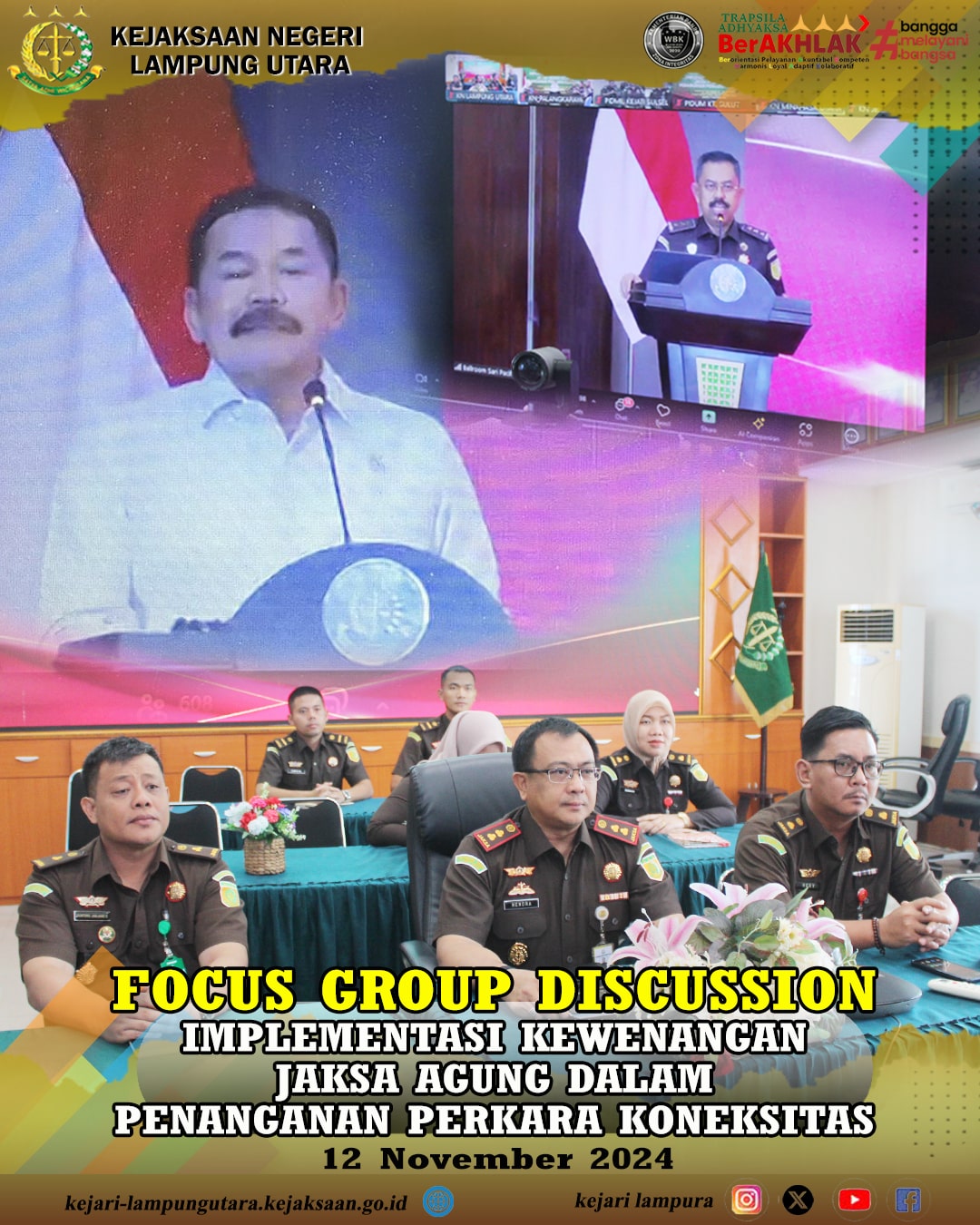 Selasa, 12 November 2024. Kepala Kejaksaan Negeri Lampung Utara Hendra Syarbaini, S.H.,M.H. Beserta Kasi Pidum Hery Susanto, S.H., Kasi Intelijen Guntoro Janjang Saptodie, S.H.,M.H., dan Jaksa Fungsional pada Kejaksaan Negeri Lampung Utara mengikuti Kegiatan Focus Group Discussion terkait Implementasi Kewenangan Jaksa Agung Dalam Penanganan Perkara Koneksitas. Kegiatan tersebut diikuti secara daring, bertempat di ruang Aula Kantor Kejaksaan Negeri Lampung Utara.