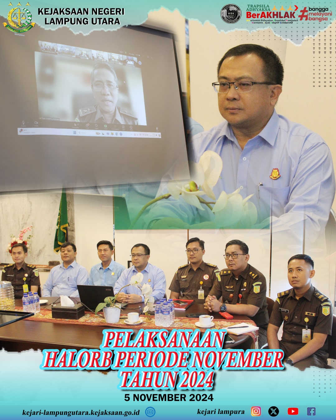 Selasa, 5 November 2024. Kepala Kejaksaan Negeri Lampung Utara Hendra Syarbaini, S.H.,M.H. beserta Kasubbagbin, para Kasi, Kaur dan Staf Pembinaan Pada Kejaksaan Negeri Lampung Utara mengikuti Kegiatan Pelaksanaan HaloRB Periode November Tahun 2024 yang diikuti secara daring Bertempat, di Ruang Kerja Kepala Kejaksaan Negeri Lampung Utara.