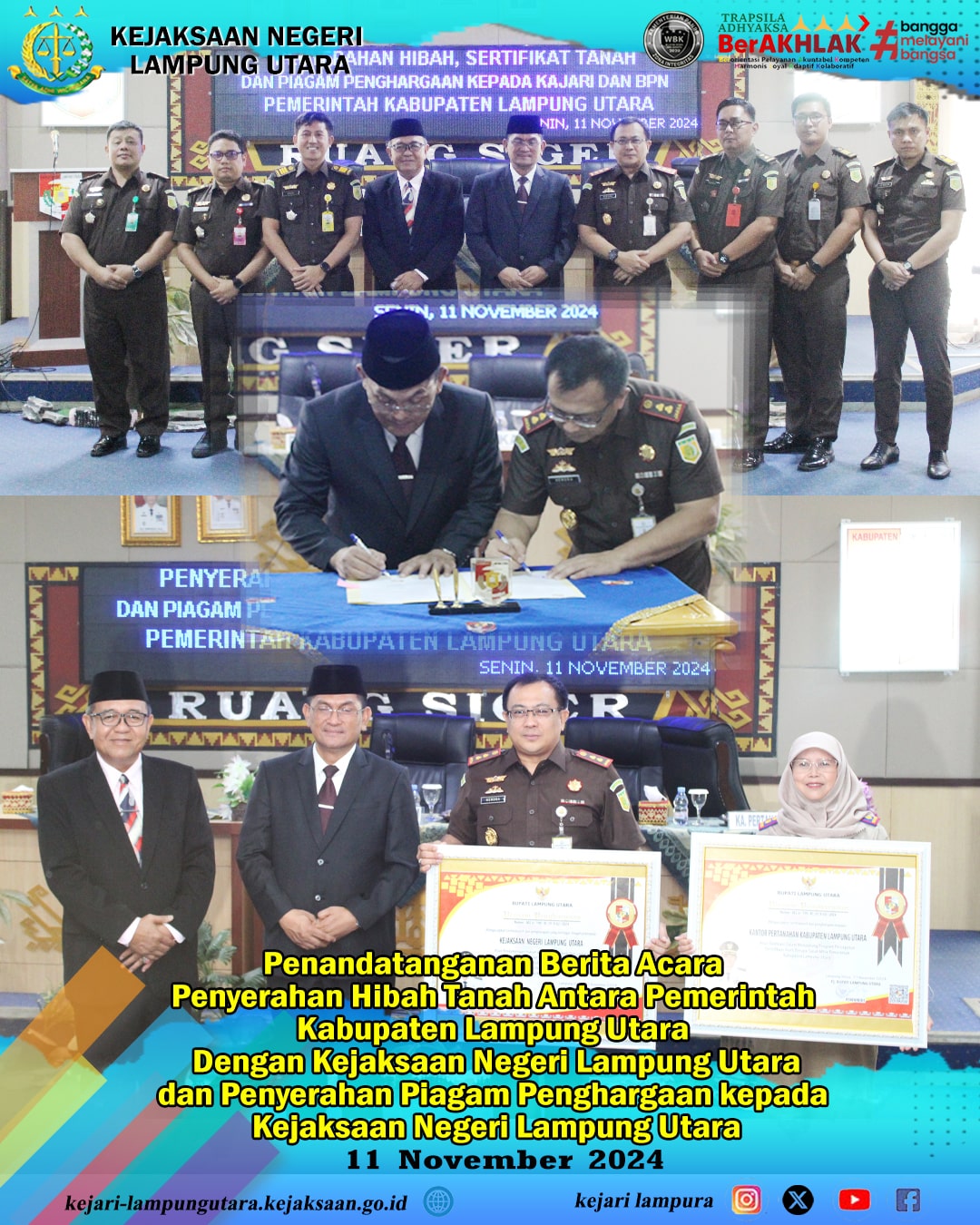 Penandatanganan berita acara penyerahan hibah tanah milik Pemerintah Daerah Kabupaten Lampung Utara dan penyerahan piagam penghargaan kepada Kejaksaan Negeri Lampung Utara.