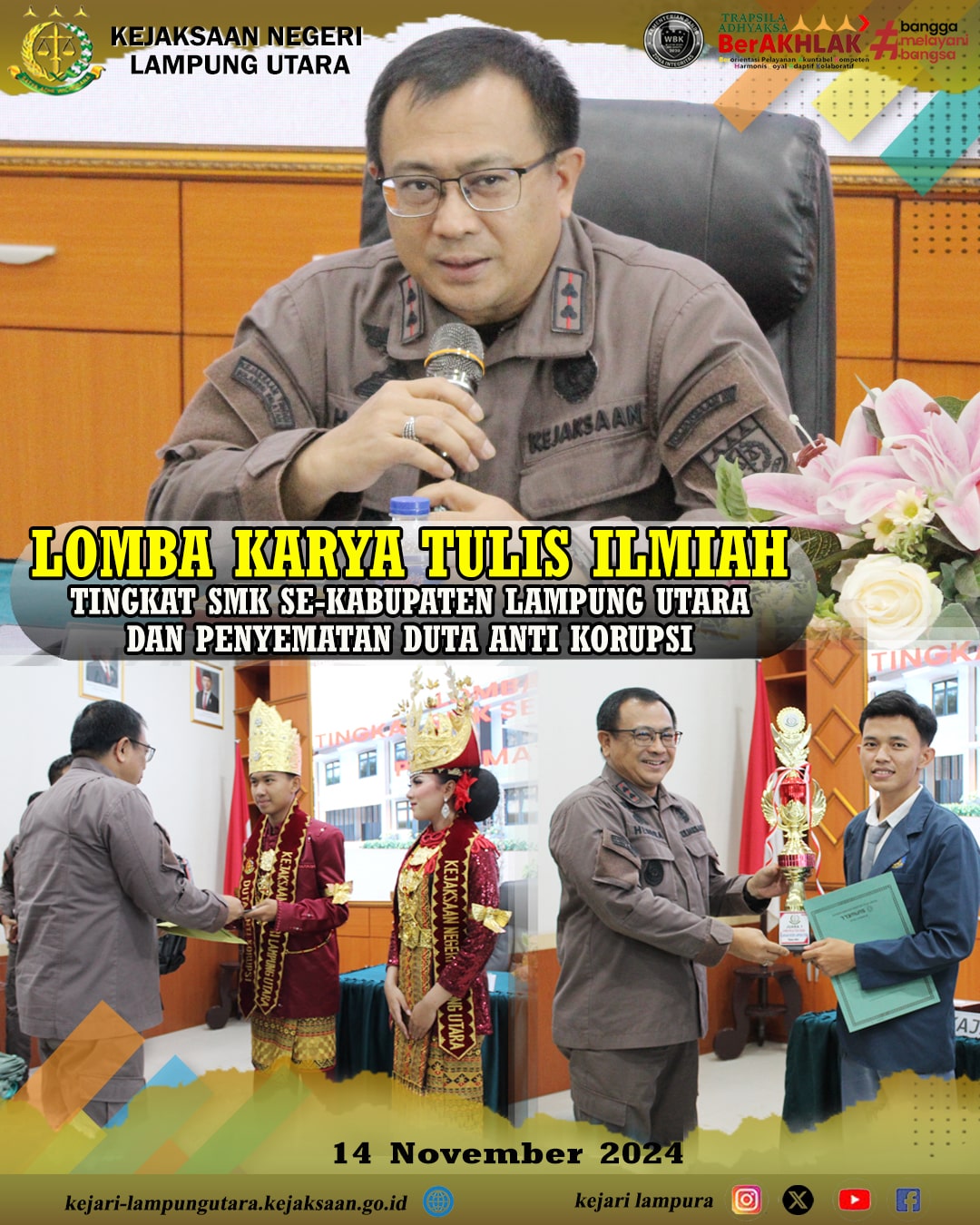 Kamis, 14 November 2024. Bertempat di Aula Kejaksaan Negeri Lampung Utara telah dilaksanakan kegiatan lomba Karya Ilmiah dan penyematan Duta Anti Korupsi dalam rangka Kampanye Anti Korupsi Tahun 2024 di Kejaksaan Negeri Lampung Utara.Kegiatan tersebut dihadiri oleh Kepala Kejaksaan Negeri Lampung Utara (Hendra Syarbaini, S.H.,M.H), Kasi Intelijen Kejaksaan Negeri Lampung Utara (Guntoro Janjang Saptodie, S.H.,M.H), Kasubsi I Seksi Intelijen Kejaksaan Negeri Lampung Utara (Glenn Lucky, S.H.,M.H), Ketua MKKS SMK Kabupaten Lampung Utara (Hamron Rohyah, S.Pd.,M.M), Dewan Juri dari STAI Ibnu Rusyd Kotabumi (Dr. Siti Afifatun, M.Pd), Dewan Juri dari Universitas…