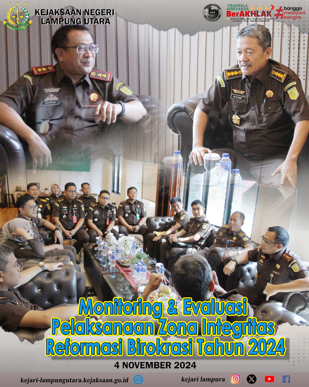 Bertempat di Kantor Kejaksaan Negeri Lampung Utara Senin, 4 November 2024 telah telah dilaksanakan kegiatan kunjungan kerja Tim Pembangunan Zona Integritas Reformasi Birokrasi Kejaksaan Tinggi Lampung dalam rangka Monitoring dan Evaluasi pelaksanaan Pembangunan Zona Integritas Reformasi Birokrasi berpredikat WBK menuju WBBM di wilayah hukum Kejaksaan Tinggi Lampung. Hadir pada kegiatan tersebut Tim Pembangunan Zona Integritas Reformasi Birokrasi Kejaksaan Tinggi Lampung yaitu Asisten Pembinaan Kejaksaan Tinggi Lampung M.Syarif, S.H.,M.H., Asisten Pengawasan Kejaksaan Tinggi Lampung Agus Widodo, S.H.,M.H., Kasubbag Daskrimti Bidang Pembinaan Kejaksaan Tinggi Lampung Feryando, S.H.,M.H., Pemeriksa Bidang Pengawasan Kejaksaan Tinggi…