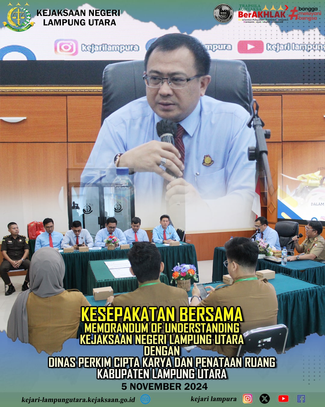 Selasa, 5 November 2024. Bertempat di Aula Kejaksaan Negeri Lampung Utara telah dilaksanakan Penandatanganan Perjanjian Kerjasama (Memorandum of Understanding) Bidang Perdata dan Tata Usaha Negara antara Kejaksaan Negeri Lampung Utara dengan Dinas Perumahan Rakyat, Kawasan Permukiman, Cipta Karya dan Penataan Ruang Kabupaten Lampung Utara yang dilanjutkan dengan Rapat Pendampingan Hukum terhadap Dinas Perumahan Rakyat, Kawasan Permukiman, Cipta Karya dan Penataan Ruang Kabupaten Lampung Utara. Hadir pada kegiatan tersebut yaitu Kepala Kejaksaan Negeri Lampung Utara Hendra Syarbaini, S.H.,M.H., Kasi Datun Kejaksaan Negeri Lampung Utara Yogi Aprianto, S.H.,M.H., Kepala Dinas Perumahan dan…