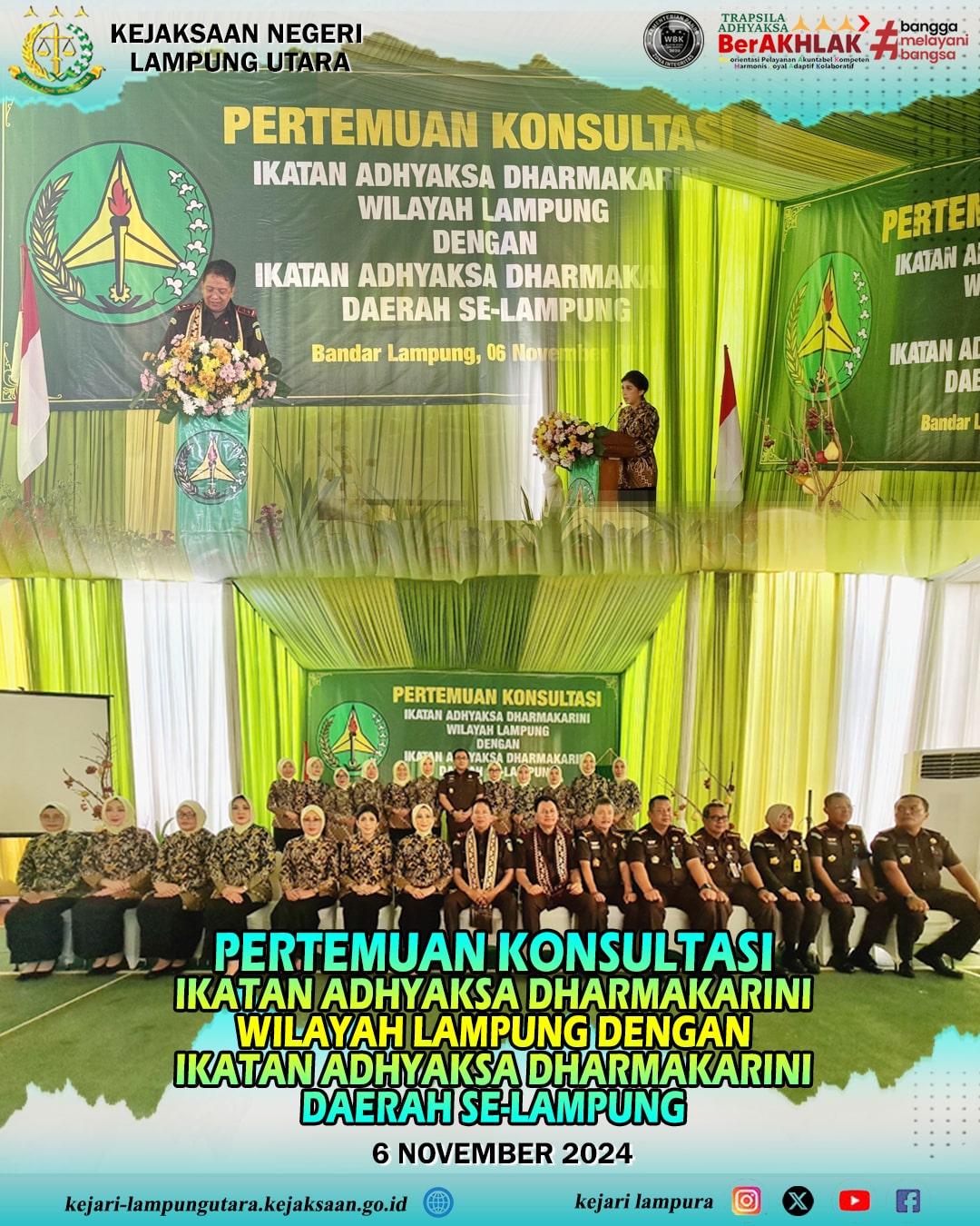 Kepala Kejaksaan Negeri Lampung Utara Hendra Syarbaini, S.H.,M.H. bersama Ketua IAD Daerah Lampung Utara Ny. Noni Hendra Syarbaini beserta Anggota menghadiri Kegiatan Pertemuan Konsultasi Ikatan Adhyaksa Dharmakarini Wilayah Lampung dengan Ikatan Adhyaksa Dharmakarini Daerah Se-Lampung yang dilaksanakan bertempat di Kejaksaan Tinggi Lampung.