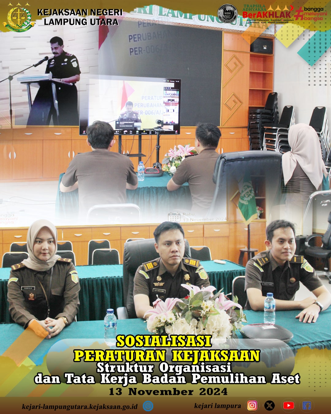 Rabu, 13 November 2024. Kepala Seksi Pemulihan Aset dan Pengelolaan Barang Bukti Kejaksaan Negeri Lampung Utara Alif Darmawan Maruszama, S.H.,M.H. beserta staf mengikuti Pelaksanaan SosialisasiPeraturan Kejaksaan Sosialisasi struktur organisasi dan tata kerja Badan Pemulihan Aset; dan Pengayaan kebijakan pengelolaan Rupbasan oleh Kejaksaan dan Kementerian Hukum dan HAM. Kegiatan diikuti secara Virtual, bertempat di ruang Aula Kantor Kejaksaan Negeri Lampung Utara.