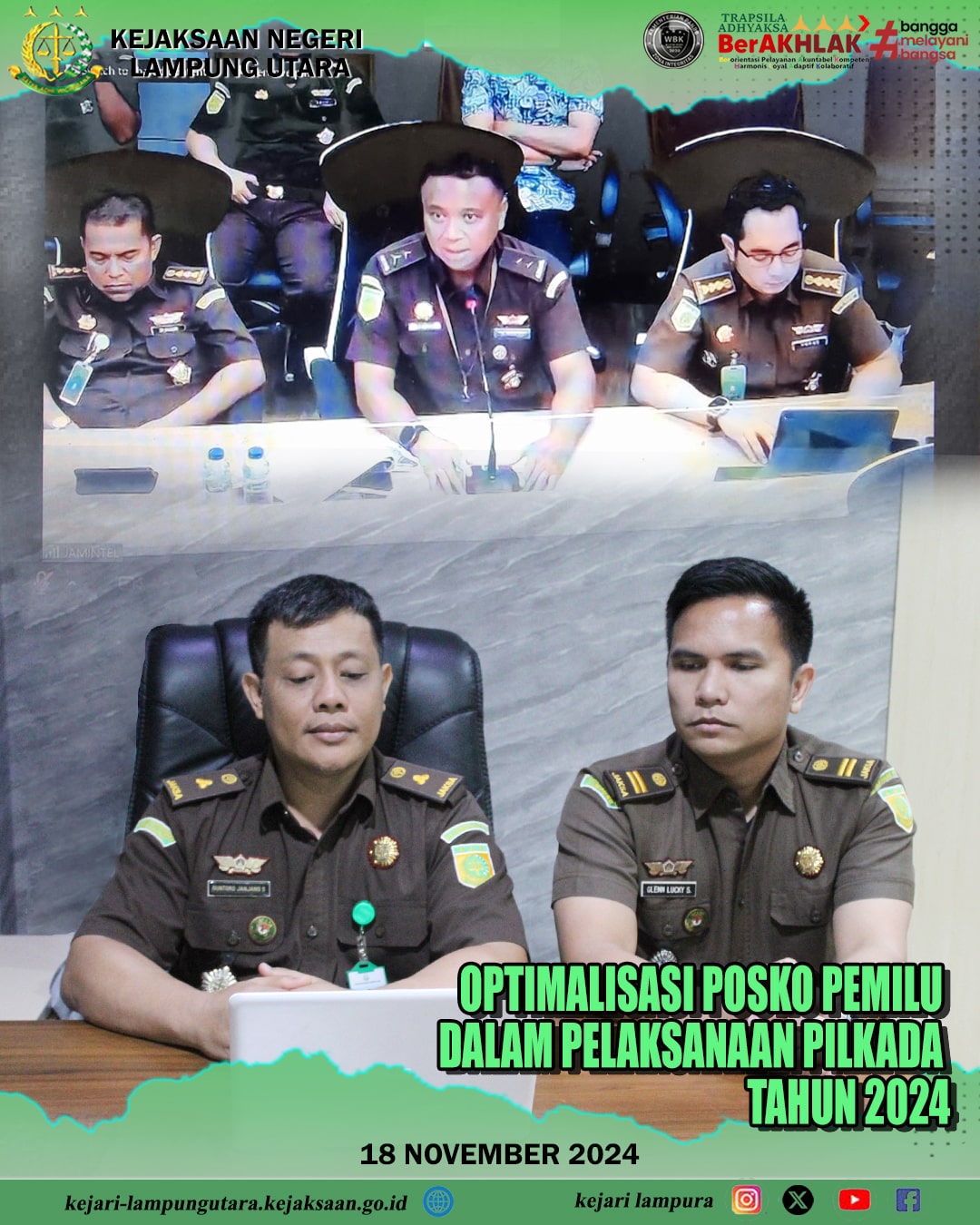Kepala Seksi Intelijen Kejaksaan Negeri Lampung Utara Guntoro Janjang Saptodie, S.H.,M.H., beserta Kasubsi A Bidang Intelijen Kejaksaan Negeri Lampung Utara Glenn Lucky, S.H.,M.H. mengikuti Kegiatan Optimalisasi Posko Pemilu dalam Pelaksanaan Pilkada Tahun 2024 yang di ikuti secara daring Melalui Aplikasi Zoom Metting. bertempat, di ruang kerja Kepala Seksi Intelijen Kejaksaan Negeri Lampung Utara.