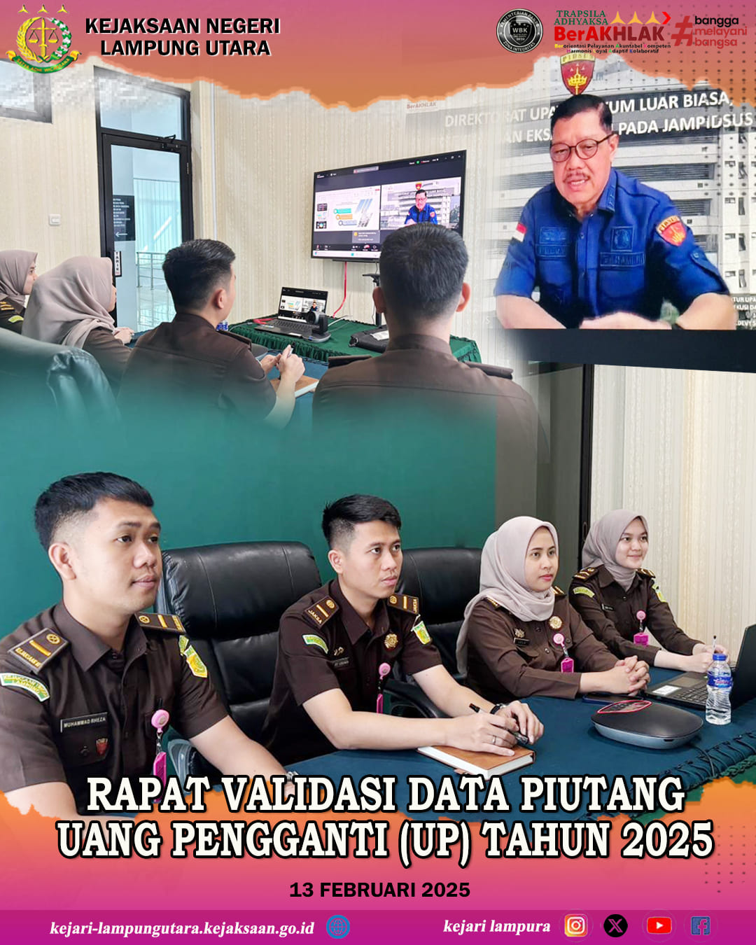 Jaksa beserta Staf Bidang Tindak Pidana Khusus pada Kejaksaan Negeri Lampung Utara mengikuti Kegiatan Rapat Validasi Dan Penyelesaian Piutang Uang Pengganti (UP) Atas Terpidana Yang Sudah Tidak Aktif Berdasarkan Data Dirjenpas yang diikuti secara daring melalui Aplikasi Video Conference bertempat diruang Vicon Kejaksaan Negeri Lampung Utara.