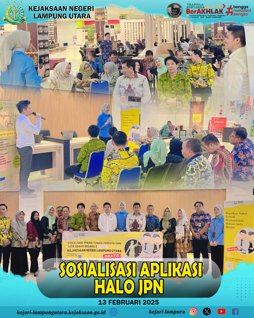 Bertempat di Mall Pelayanan Publik Lampung Utara Jaksa Pengacara Negara pada Kejaksaan Negeri Lampung Utara Faris Rayaguna, S.H., Qoridawati Purnalis, S.H., beserta Staf Bidang Perdata dan Tata Usaha Negara Kejaksaan Negeri Lampung Utara Ratu Indah Deli Putri Melaksanaan Kegiatan Sosialisasi Aplikasi Halo JPN yang bertujuan untuk memberikan pelayanan kepada masyarakat.