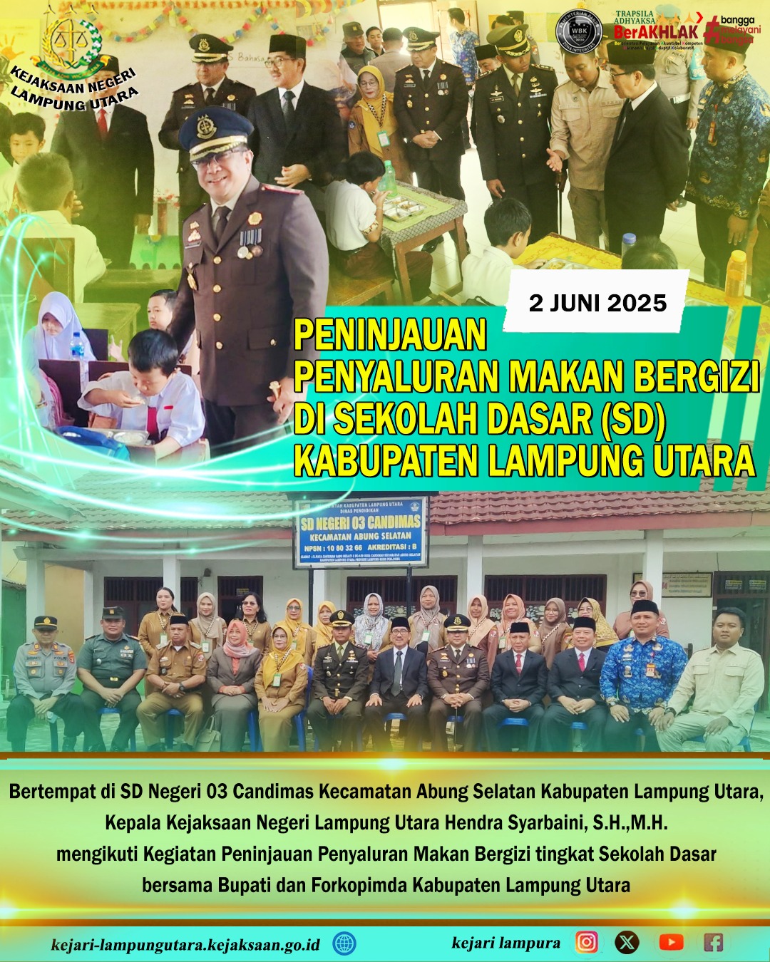 Bertempat di SD Negeri 03 Candimas Kecamatan Abung Selatan Kabupaten Lampung Utara, Kepala Kejaksaan Negeri Lampung Utara Hendra Syarbaini, S.H.,M.H. mengikuti Kegiatan Peninjauan Penyaluran Makan Bergizi tingkat Sekolah Dasar bersama Bupati dan Forkopimda Kabupaten Lampung Utara