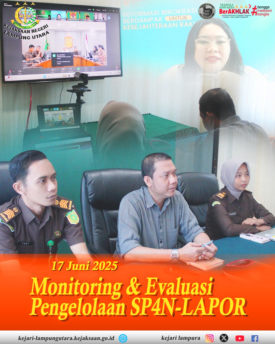 Kepala Seksi Intelijen Kejaksaan Negeri Lampung Utara Ready Mart Handry Royani, S.H. bersama Staf Intelijen selaku Operator SP4N Lapor pada Kejaksaan Negeri Lampung Utara mengikuti Kegiatan Monitoring dan Evaluasi Pengelolaan SP4N-LAPORyang diikuti secara daring melalui Aplikasi Video Conference (Vicon), bertempat di ruang Vicon Kejaksaan Negeri Lampung Utara.