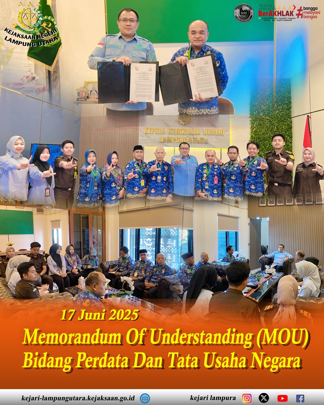 Bertempat di Aula Kejaksaan Negeri Lampung Utara telah dilaksanakan Penandatanganan Perjanjian Kerjasama Bidang Perdata dan Tata antara Kejaksaan Negeri Lampung Utara dengan Badan Pengelola Keuangan dan Aset Daerah Kabupaten Lampung Utara. Hadir pada kegiatan tersebut yaitu Kepala Kejaksaan Negeri Lampung Utara Hendra Syarbaini, S.H.,M.H, Kasi Datun Kejaksaan Negeri Lampung Utara Yogi Aprianto, S.H.,M.H, Kepala Badan Pengelola Keuangan dan Aset Daerah Kabupaten Lampung Utara Ir. Mikael Saragih, M.M., Para JPN pada Kejaksaan Negeri Lampung Utara yaitu Faris Rayaguna, S.H. dan Qoridawati Purnalis, S.H., Staff Bidang Perdata dan Tata Usaha Negara pada…