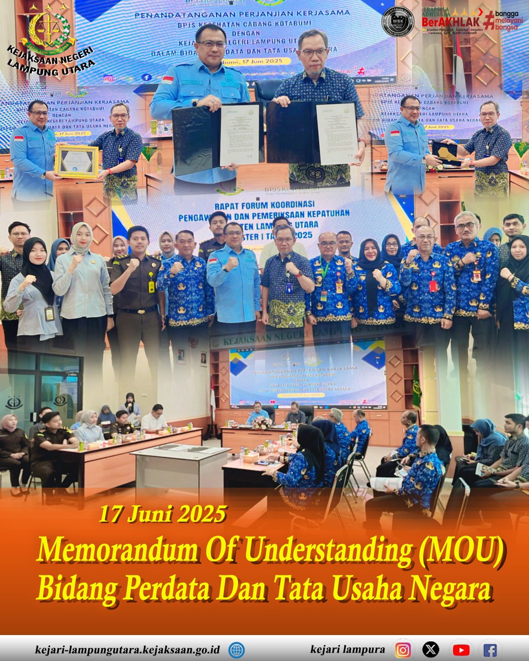 Bertempat di Aula Kejaksaan Negeri Lampung Utara telah dilaksanakan Penandatanganan Perjanjian Kerjasama Bidang Perdata dan Tata antara Kejaksaan Negeri Lampung Utara dengan Badan Penyelenggara Jaminan Sosial Kesehatan Cabang Kotabumi dan Kegiatan Forum Koordinasi Pengawasan dan Pemeriksaan Kepatuhan Kabupaten Lampung Utara Semester I Tahun 2025.Hadir pada kegiatan tersebut yaitu Kepala Kejaksaan Negeri Lampung Utara Hendra Syarbaini, S.H.,M.H, Kasi Datun Kejaksaan Negeri Lampung Utara Yogi Aprianto, S.H.,M.H, Kepala Badan Penyelenggara Jaminan Sosial Kesehatan Cabang Kotabumi Wahyu Santoso, M.M., Para JPN pada Kejaksaan Negeri Lampung Utara yaitu Faris Rayaguna, S.H. dan Qoridawati Purnalis,…