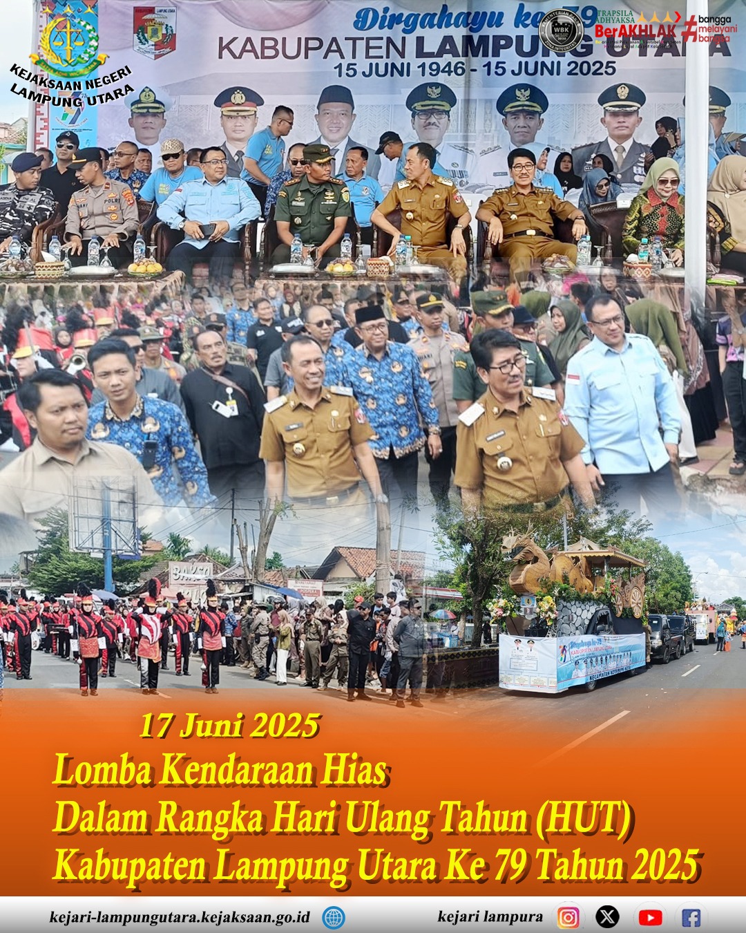Kepala Kejaksaan Negeri Lampung Utara Hendra Syarbaini, S.H.,M.H. menghadiri Kegiatan Lomba Kendaraan Hias dalam rangka Hari Ulang Tahun (HUT) Kabupaten Lampung Utara Ke 79 Tahun 2025, Bertempat di Jalan Alamsyah Ratu Perwira Negara Kelurahan Kelapa Tujuh Kecamatan Kotabumi Selatan Kabupaten Lampung Utara.