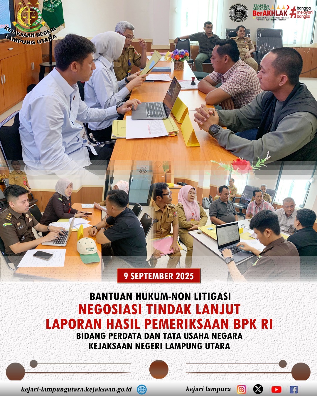 Selasa, 9 September 2025 Dilakukan Bantuan Hukum-Non Litigasi (Negosiasi Tindak Lanjut Laporan Hasil Pemeriksaan BPK RI) pada Bidang Perdata Dan Tata Usaha Negara Kejaksaan Negeri Lampung Utara dan Inspektorat Kabupaten Lampung Utara di Aula Kejaksaan Negeri Lampung Utara.