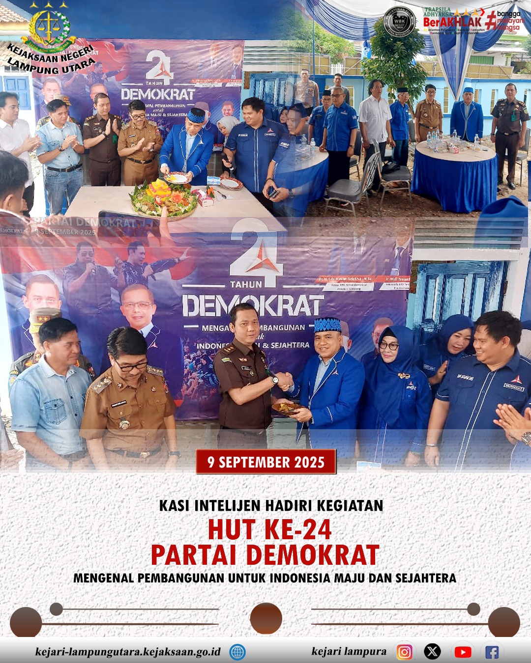 Selasa, 9 September 2025. Kepala Seksi Intelijen Kejaksaan Negeri Lampung Utara Ready Mart Handry Royani, S.H. menghadiri Kegiatan HUT Ke-24 Partai Demokrat “Mengawal Pembangunan Untuk Indonesia Maju dan Sejahtera”, Bertempat di Sekretariat DPC Partai Demokrat Kabupaten Lampung Utara