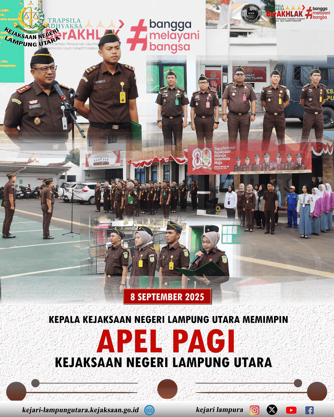 Senin, 8 September 2025. Kepala Kejaksaan Negeri Lampung Utara Hendra Syarbaini, S.H.,M.H. memimpin Kegiatan Apel Pagi yang diikuti oleh Para Kasi, Kasubsi, JPU, serta Seluruh Pegawai dan Honorer pada Kejaksaan Negeri Lampung Utara.