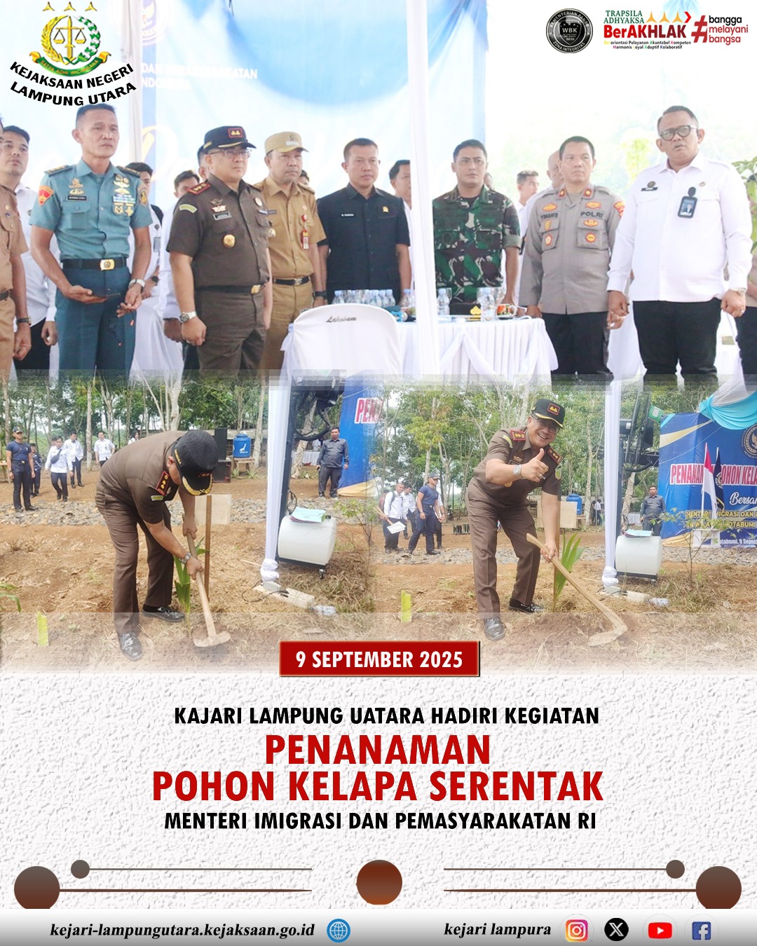Selasa, 9 September 2025. Kepala Kejaksaan Negeri Lampung Utara Hendra Syarbaini, S.H.,M.H. menghadiri Kegiatan Penanaman Pohon Kelapa Serentak oleh Menteri Imigrasi dan Pemasyarakatan RI, bertempat di Desa Banjar Agung Kecamatan Abung Timur Kotabumi Kabupaten Lampung Utara.