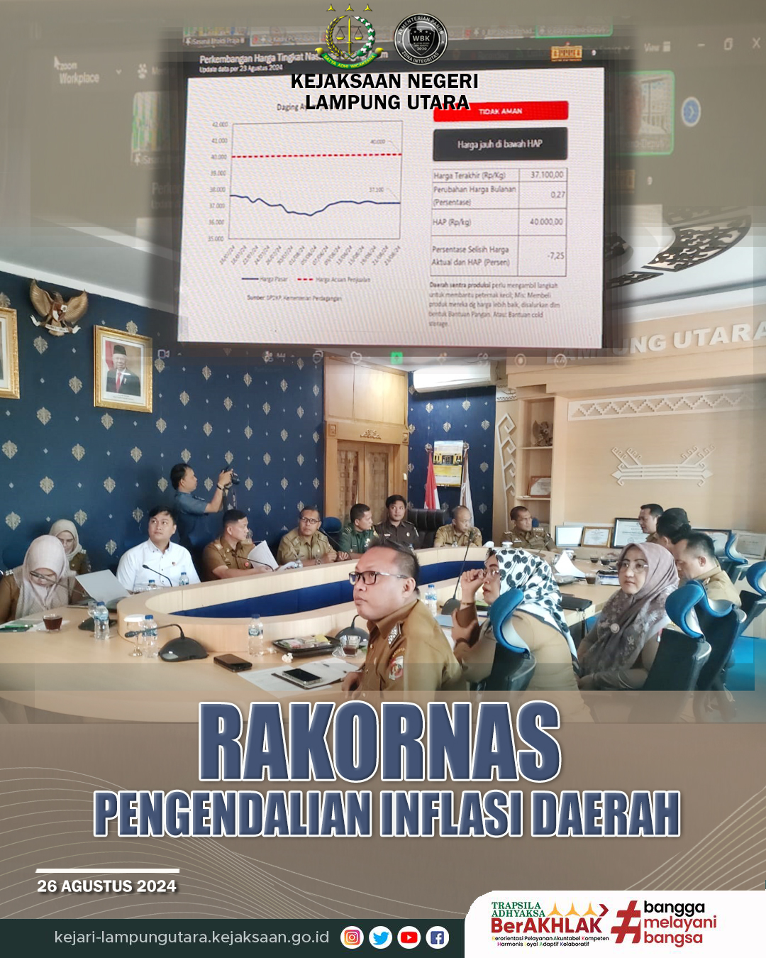 Senin, 26 Agustus 2024. Kepala Sub Bagian Pembinaan Kejaksaan Negeri Lampung Utara Adhi Prasetyo Handono, S.H. menghadiri rapat secara daring terkait Pengendalian Inflasi Daerah di ruang rapat Bupati Lampung Utara.