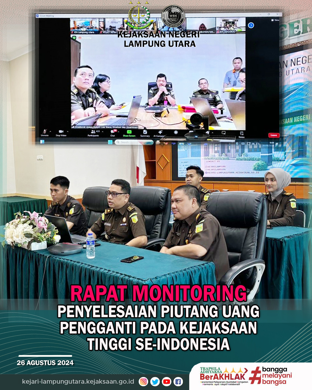 Senin, 26 Agustus 2024. Kepala Seksi Tindak Pidana Khusus Kejaksaan Negeri Lampung Utara (Muhammad Azhari Tanjung, S.H.) beserta Jaksa pada Tindak Pidana Khusus dan Seksi Pengelolaan Keuangan Kejaksaan Negeri Lampung Utara menghadiri Undangan Rapat Monitoring Penyelesaian Piutang Uang Pengganti pada Kejaksaan Tinggi se-Indonesia yang diikuti secara daring melalui Aplikasi Video Conference bertempat di Ruang Aula Kantor Kejaksaan Negeri Lampung Utara.